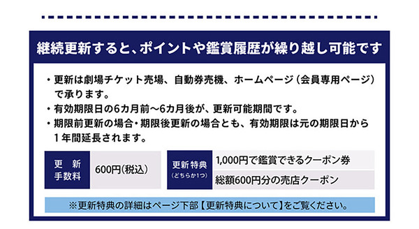 さらに、継続更新で鑑賞履歴の繰り越しも可能の上、更新のたびに1,000円で映画が観れるクーポン、もしくは売店で使える600円クーポンが貰えるのでやっぱり継続更新もお得です。