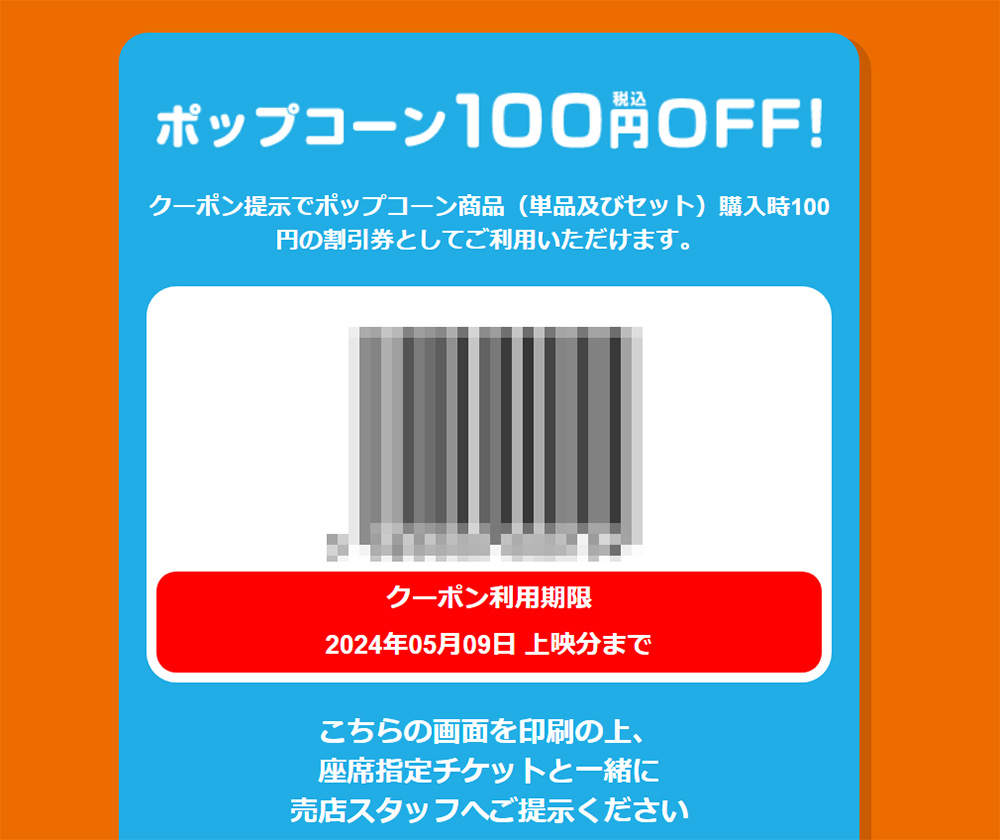そして会員画面上の専用バーコードをポップコーン購入時に売店に提示すれば、100円OFFとなりありがたし!
