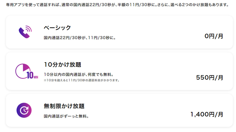 - 10分かけ放題(月額550円)…10分以内の国内通話が無料。